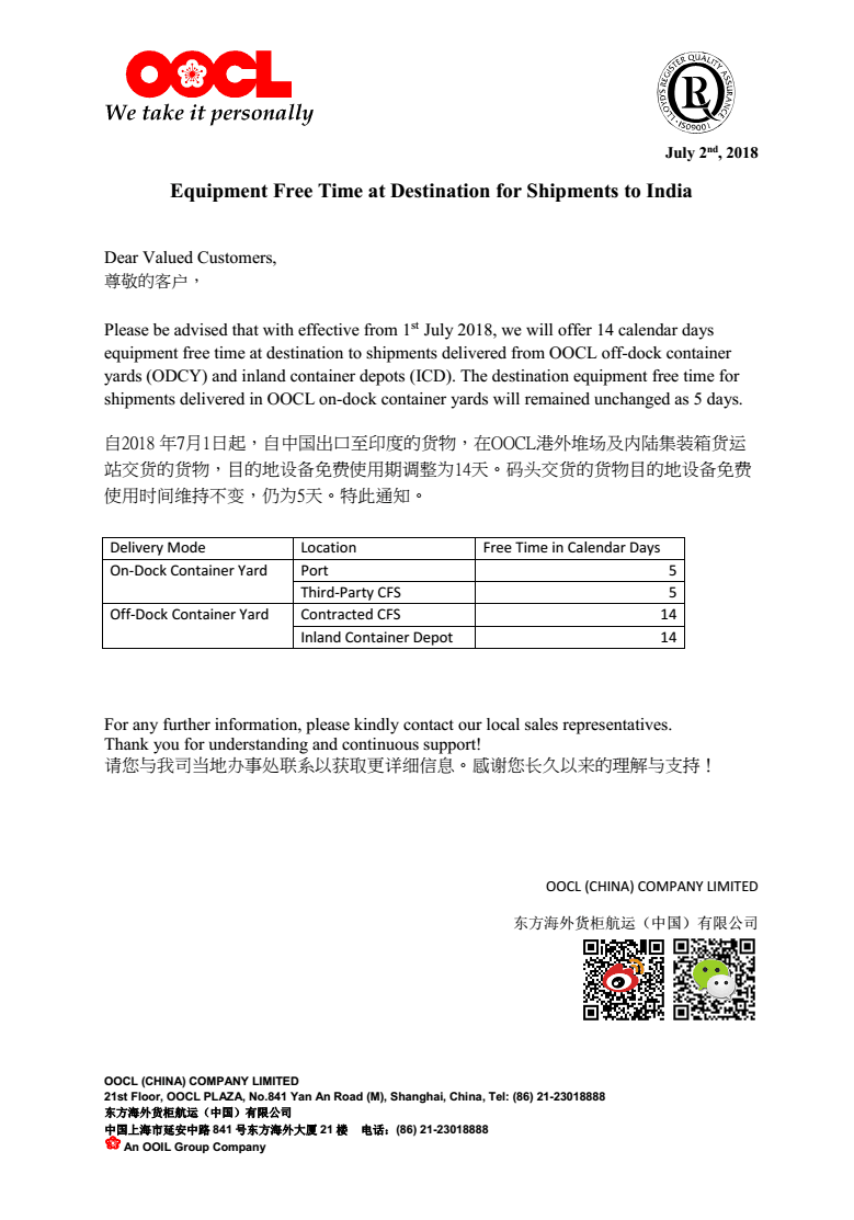 OOCL最新通知:Equipment Free Time at Destination for Shipments to India
