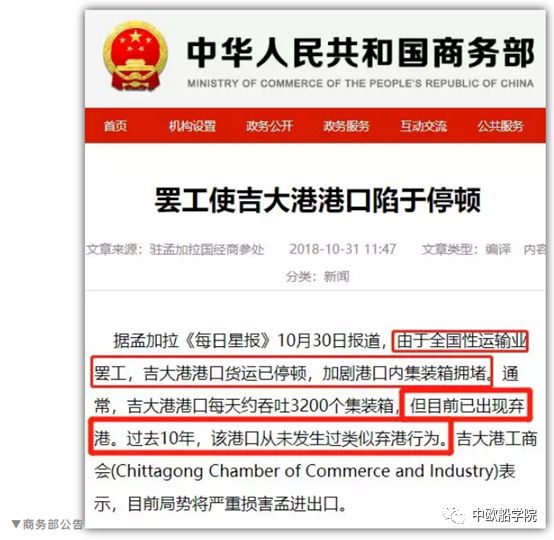 商务部10月31日讯 据中国驻孟加拉国大使馆经济商务参赞处消息,孟加拉《每日星报》报道,由于全国性运输业罢工,吉大港港口货运已停顿,加剧港口内集装箱拥堵。通常,吉大港港口每天约吞吐3200个集装箱,但目前已出现弃港。过去10年,该港口从未发生过类似弃港行为。吉大港工商会(Chittagong Chamber of Commerce and Industry)表示,目前局势将严重损害孟进出口。